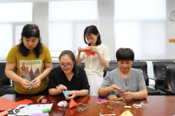 随后开展包粽子活动,大家有说有笑,相互交流,在包粽子的过程中一起体验劳动的乐趣,感受节日的气息。碧绿的粽叶在手中上下翻飞、左折右转,大家一起填糯米、放蜜枣、裹叶子、扎线,不一会儿形状各异的粽子便成堆呈现在眼前,粽叶飘香,气氛和谐。
