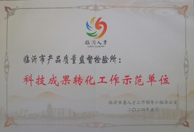 为推动人才链、教育链、产业链、创新链深度融合,赋能全市经济社会高质量发展,5月15日,市检验检测中心质检所参加由市委人才工作领导小组办公室组织召开的临沂市人才创新创业暨科技成果转化对接会,会上临沂市产品质量监督检验所被授予“科技成果转化工作示范单位”荣誉称号。