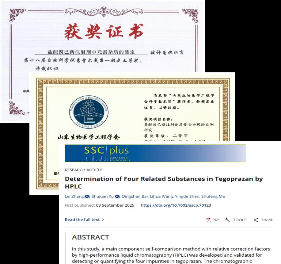 9月5日,山东生物医学工程学会科学技术奖榜单揭晓,中心化药实验室张磊、徐树娟团队主导的"盐酸溴己新注射剂质量安全风险监测研究"项目荣获二等奖;同期,团队另一成果"盐酸溴己新注射剂中元素杂质的测定"摘得临沂市第十八届自然科学优秀学术成果三等奖;在8月公布的临沂市科协调研课题结题情况通报中,该团队完成结题三项,其中"健康中国背景下临沂市特医食品产业现状及发展研究"获评优秀成果二等奖;学术研究方面,化药室在Separation Science Plus发表题为"Determination of Four Related Substances in Tegoprazan by HPLC"的高水平论文,实现连续三年在国际权威期刊发表研究成果,彰显团队扎实的科研功底与国际化学术视野。