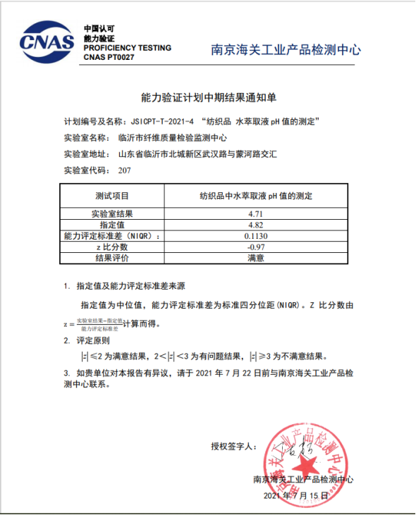 通过该两项能力验证试验的圆满完成,增加了纤监中心全体检验人员的信心,鼓舞了大家的志气,下一步要更好地研究能力验证组织方的验证结果分析报告,找出我们存在的弱点和不足,继续发挥优势,保证实验数据的准确可靠,为打造淮海经济区检验检测知名品牌贡献纤监力量。