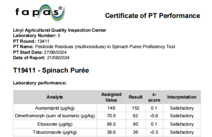 近日,由英国FAPAS分析实验室组织的“菠菜中农药残留检测”国际能力验证项目结果揭晓,市检验检测中心农检中心顺利通过该项能力验证,获得“满意”结果。